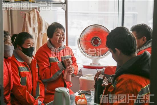 2023年12月12日,在乌鲁木齐经济技术开发区(头屯河区)高铁街道玄武湖社区,环卫工在室内稍作休息。
