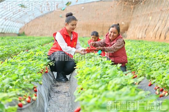 2023年12月14日,库车市比西巴格乡其乃巴格村党员志愿者和村民一起采摘草莓。