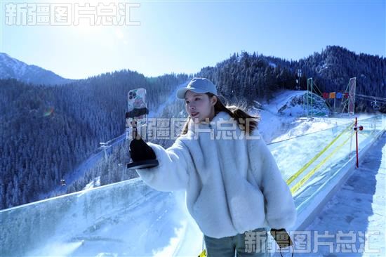 2023年12月14日,游客在乌鲁木齐市丝绸之路山地度假区滑雪场观赏雪景。