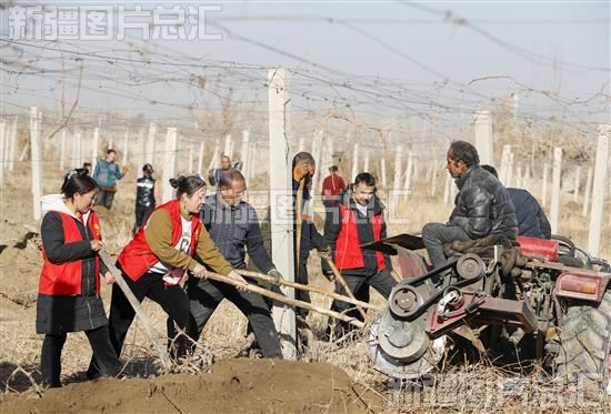 2023年12月6日,志愿者和村民在洛浦县恰尔巴格镇墩买里村葡萄种植园里将葡萄下架埋藤。