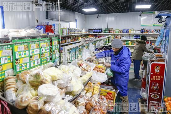 2023年12月13日,在乌鲁木齐经济技术开发区(头屯河区)中亚北路片区科技园社区的蔬菜副食品直销点,工作人员在整理货架上的物品。