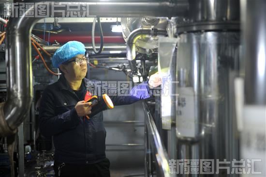 2023年12月12日,新疆科宇科技有限公司员工检查番茄红素生产设备运行情况。
