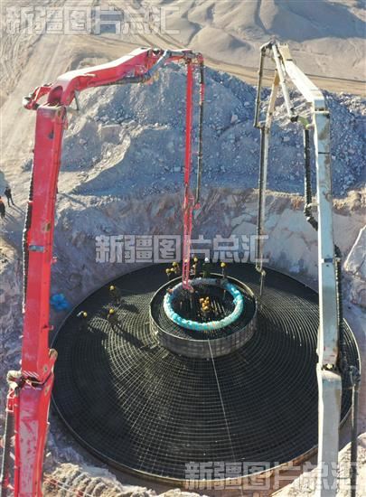 2023年12月7日,在位于哈密大南湖矿区的中煤哈密一通道80万千瓦风电+20万千瓦光伏多能互补项目现场,中煤建筑安装工程集团有限公司新疆分公司施工人员在浇筑风机基础。