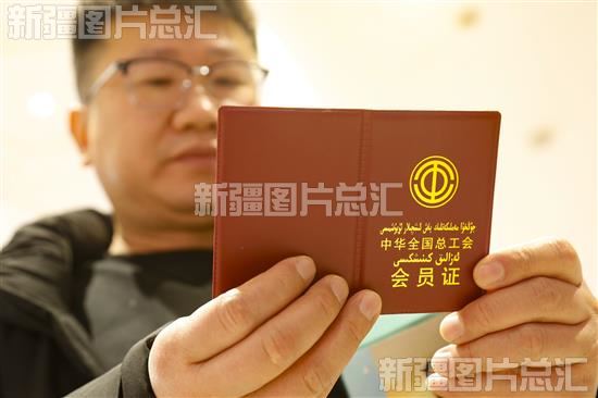 2023年12月5日,在乌鲁木齐经济技术开发区(头屯河区)居然之家,网约车司机何振豪查看刚刚领取的中华全国总工会会员证。