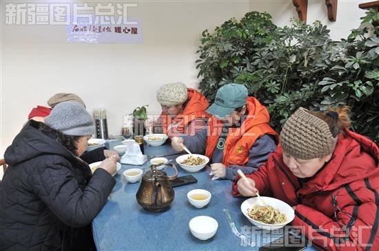 2023年12月14日,环卫工人在位于天山区中湾街的塔兰奇拌面馆内设立的石榴云新疆日报暖心屋免费吃午餐。