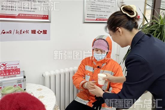 2023年12月14日,中国人民财产保险股份有限公司乌鲁木齐市分公司员工为环卫工人在暖心屋倒茶水。