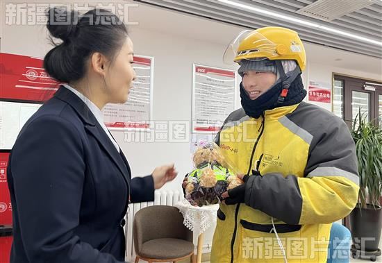 2023年12月14日,中国人民财产保险股份有限公司乌鲁木齐市分公司员工为外卖员赠送礼物。