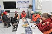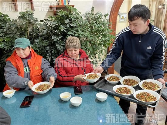 2023年12月14日,环卫工人在位于天山区中湾街的塔兰奇拌面馆内设立的石榴云新疆日报暖心屋免费吃午餐。