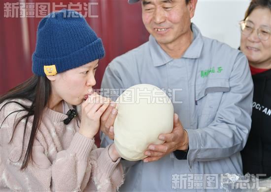 2023年12月20日,“四季看新疆”之“追着雪花看新疆”主题采访活动全媒体报道团队成员体验用腰站子村的面粉活的面“吹气球”。