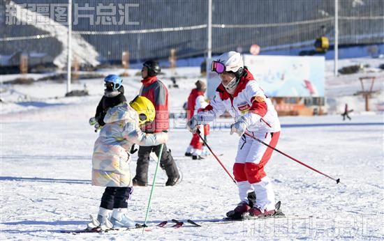 2023年12月19日,滑雪教练在丝绸之路山地度假区教小朋友滑雪。