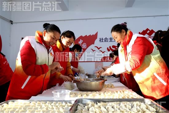 2023年12月20日,新疆生产建设兵团第二师22团通达社区志愿者在包饺子。