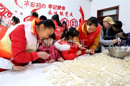 2023年12月20日,新疆生产建设兵团第二师22团通达社区志愿者在教小朋友包饺子。