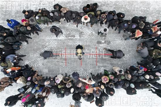 2023年12月21日,木垒哈萨克自治县大南沟乌孜别克族乡群众在冬宰美食文化节上观看押加(背向拔河)比赛。
