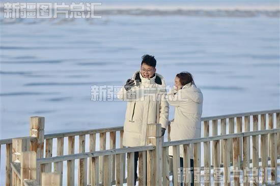 2023年12月21日,游客在乌伦古湖木栈道上留影。