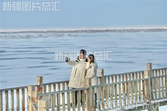 2023年12月21日,游客在乌伦古湖木栈道上留影。