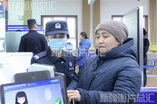 2023年12月14日,阿拉山口公路口岸,阿拉山口出入境边防检查站民警帮助入境游客录入信息。