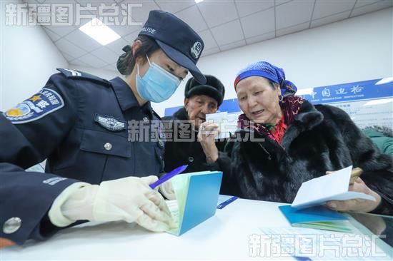 2023年12月14日,阿拉山口公路口岸,阿拉山口出入境边防检查站民警帮助游客填写材料。
