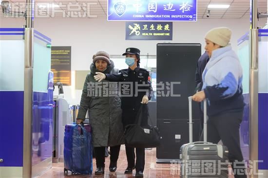 2023年12月14日,阿拉山口公路口岸,阿拉山口出入境边防检查站民警引导游客进入边检通道。