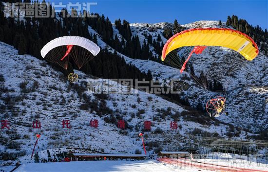 2023年12月24日,游客在位于温宿县天山托木尔景区·塔村滑雪场乘坐动力伞游玩。