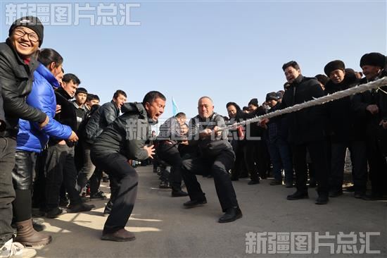 2023年12月24日,游客和当地群众在乌什县泉域星空国际滑雪场参加拔河比赛。