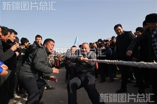 2023年12月24日,游客和当地群众在乌什县泉域星空国际滑雪场参加拔河比赛。