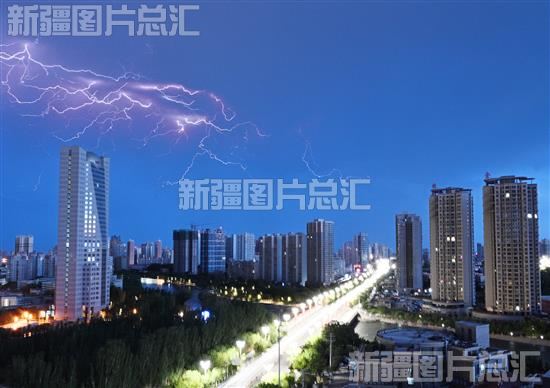关键字:巴音郭楞蒙古自治州 巴州 库尔勒市 城市 夜空 雷电 天气 雷电 乌云 小雨 闪电