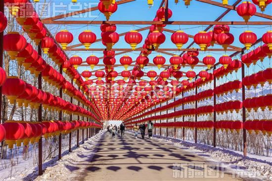 2023年12月23日,滑雪爱好者和游客通过灯笼长廊进入那拉提国际滑雪场。