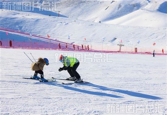 2023年12月23日,那拉提国际滑雪场专业教练对滑雪爱好者进行一对一训练。
