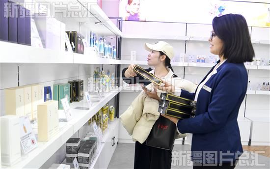 2023年10月12日,游客在乌鲁木齐大巴扎步行街美林购全球精品免税店选购进口护扶品。
