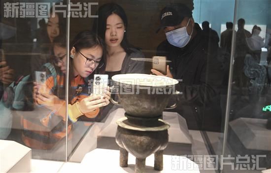 2023年10月4日,游客在新疆博物馆参观青铜器里的古代中国展。