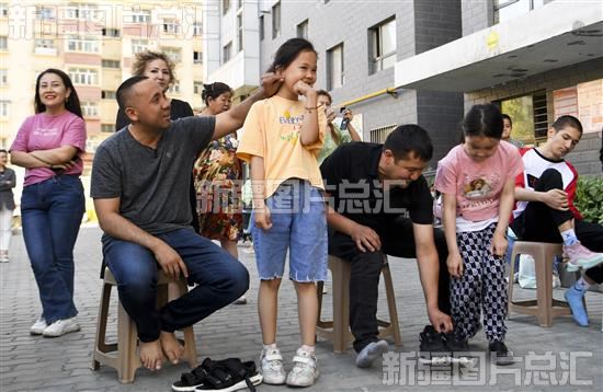 2023年6月16日,乌鲁木齐市天山区新华南路街道三桥社区居民在参加亲子活动比赛时鼓励孩子。