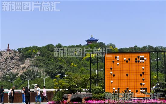 乌鲁木齐市西大桥上围棋棋盘主题花堆(2023年6月16日摄)。