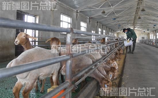 2023年3月7日,新疆西域沐羊人农牧科技有限公司繁育基地的员工在给红羊喂饲料。
