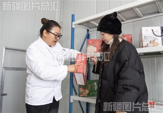 2023年12月27日,奇台县老奇台镇福禄手工挂面厂,奇台县手工挂面非物质文化遗产传承人白云飞的妻子王丽霞向前来购买挂面的顾客介绍产品。