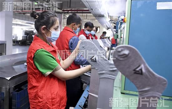 2023年6月1日,新疆美旭纺织有限公司员工在给袜子定型。