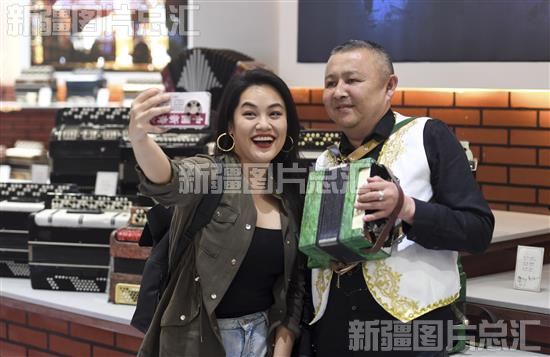 2023年5月17日,中央广播电视总台CGTN英语记者李菁菁在塔城市手风琴博物馆采访手风琴演奏员。