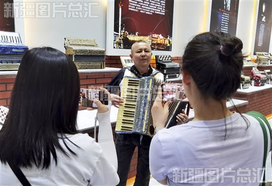 2023年5月17日,游客在塔城市手风琴博物馆聆听手风琴演奏,塔城市也被称为“手风琴之城”。