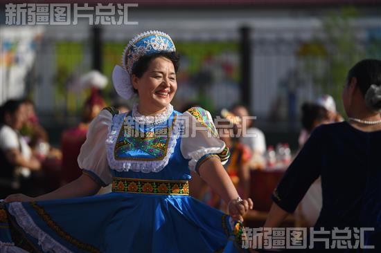 2023年5月17日,塔城市新城街道哈尔墩社区居民在邻里节百家宴跳起俄罗斯舞蹈。