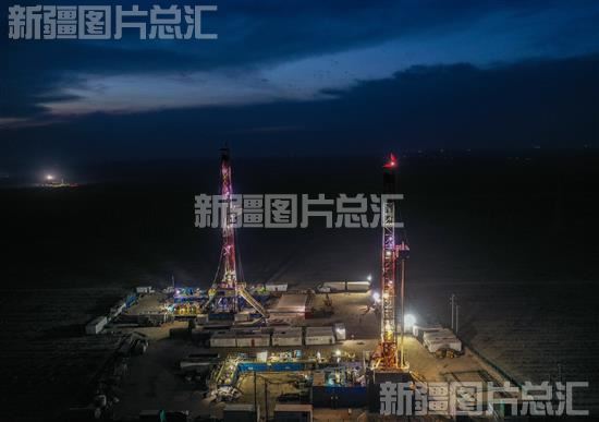 2023年12月28日凌晨,位于温宿县的中曼阿克苏油田红52井进行下钻作业(无人机摄)。