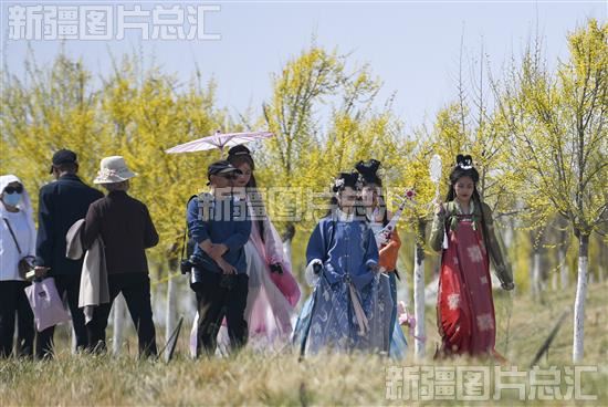 2023年4月29日,游客在博乐市万亩海棠生态园游玩。
