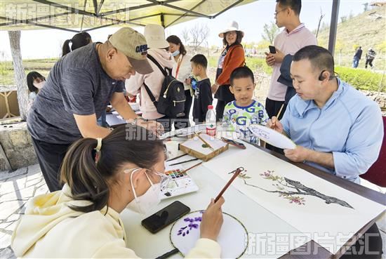 2023年4月29日,博乐市书画协会的文艺工作者与游客互动。