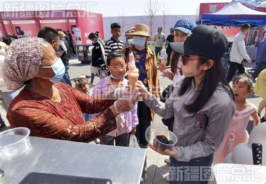 2023年4月29日,游客在博乐海棠文化旅游节上品尝美食。