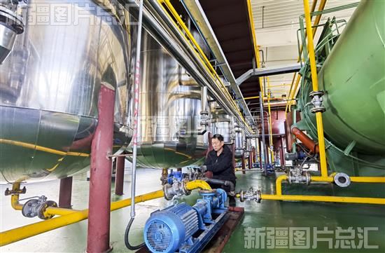 2023年4月26日,新疆锡伯图商贸有限公司员工在榨油车间工作。