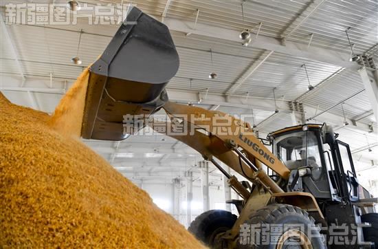 2023年4月26日,新疆锡伯图商贸有限公司员工在堆放生产的玉米压片饲料。