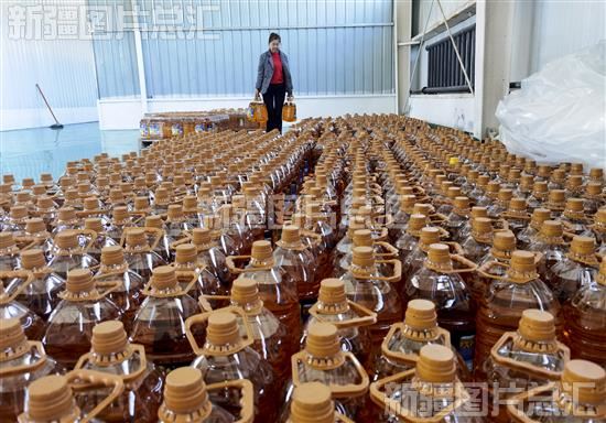 2023年4月26日,新疆锡伯图商贸有限公司员工在摆放生产的食用油。