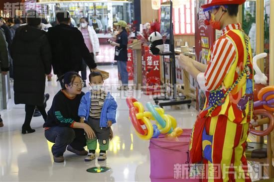 2024年1月1日,在乌鲁木齐经济技术开发区(头屯河区)万达广场,小朋友被小丑现场制作的气球玩具吸引。