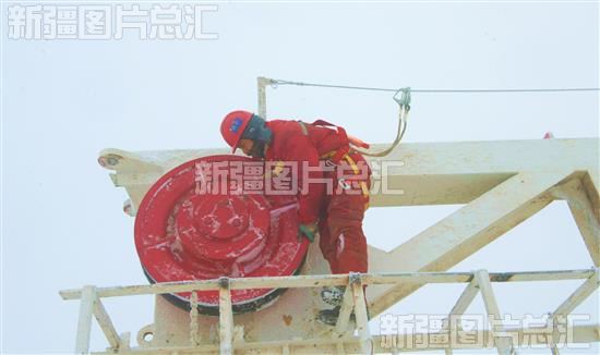 2024年1月1日,中国石油集团西部钻探工程有限公司准东钻井公司70126钻井队石油工人冒着严寒攀爬到井架上维护设备。