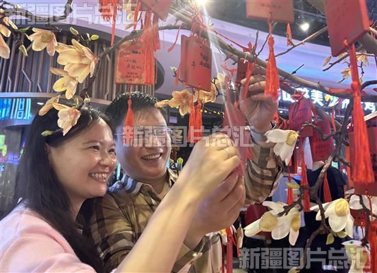 2024年1月1日,一对情侣在乌鲁木齐德汇万达广场内的许愿树上悬挂许愿牌。