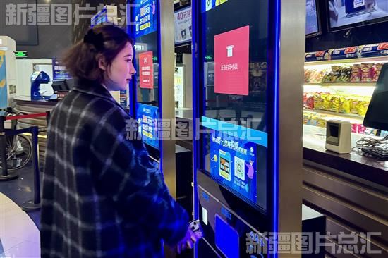 2024年1月1日,顾客正在乌鲁木齐市天山区一家影院里操作自助机取票。