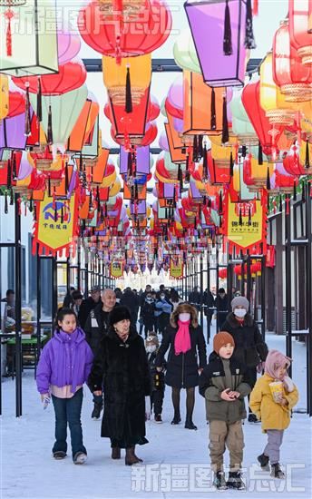 2024年1月1日,游客在呼图壁县锦华牛街灯笼长廊游玩。